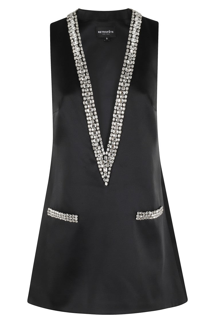 The Nancie dress by Retrofête epitomizes contemporary glamour with a striking deep V-neckline embellished with exquisite jewels. Its slightly flared silhouette is crafted from smooth fabric that offers a gentle sheen, ensuring you make a statement at any event. The design's playful charm is complemented by sleeveless styling, allowing for ease of movement, making it the perfect choice for both chic daytime outings and elegant evening affairs.