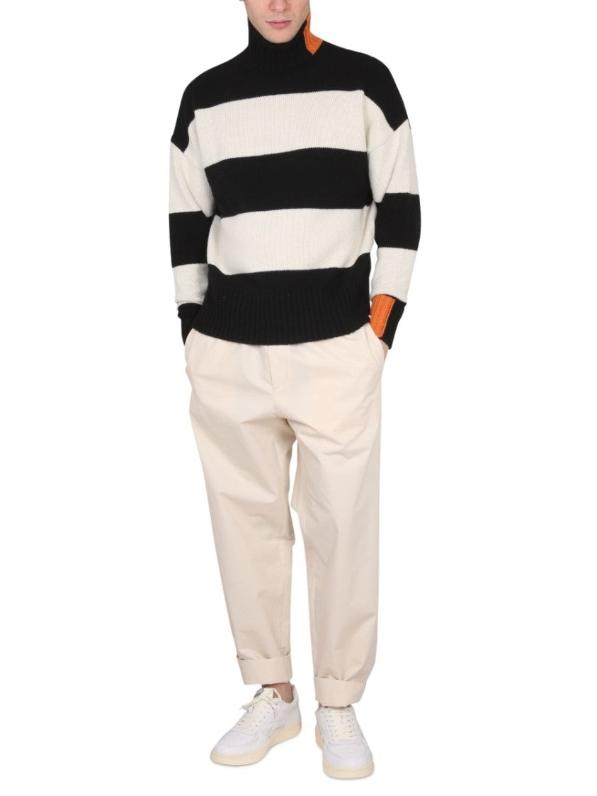 This rugby shirt from Right For features a unique design with bold black and white horizontal stripes. The high neck and ribbed cuffs enhance its sporty appeal. A vibrant orange detail on the neck and cuff adds a modern touch, making it suitable for both athletic and casual occasions.