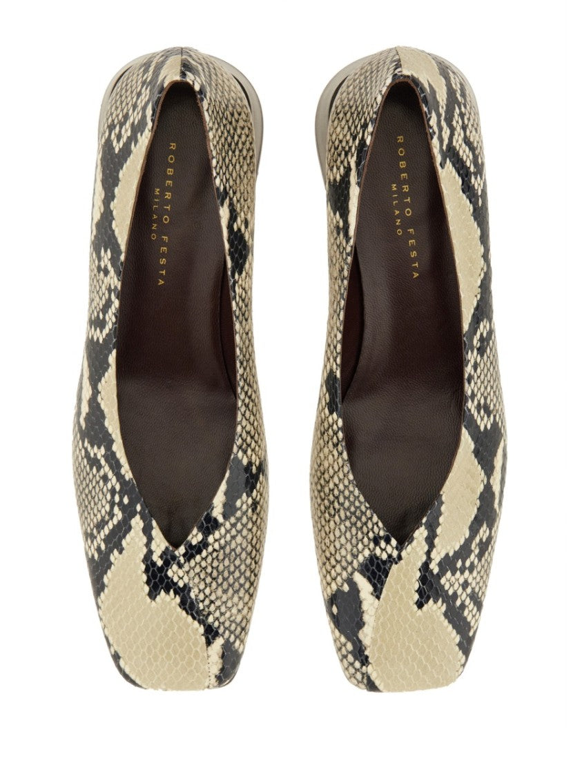Roberto Festa offers a stunning décolleté called "Vina," crafted in Italy from premium 100% calf leather. The shoe showcases a unique snakeskin pattern in chic neutral shades of beige, black, and grey, enhancing its elegant appeal. A pointed toe provides a polished touch, while a 5 cm low block heel guarantees comfort and style, making it an ideal choice for any outfit.