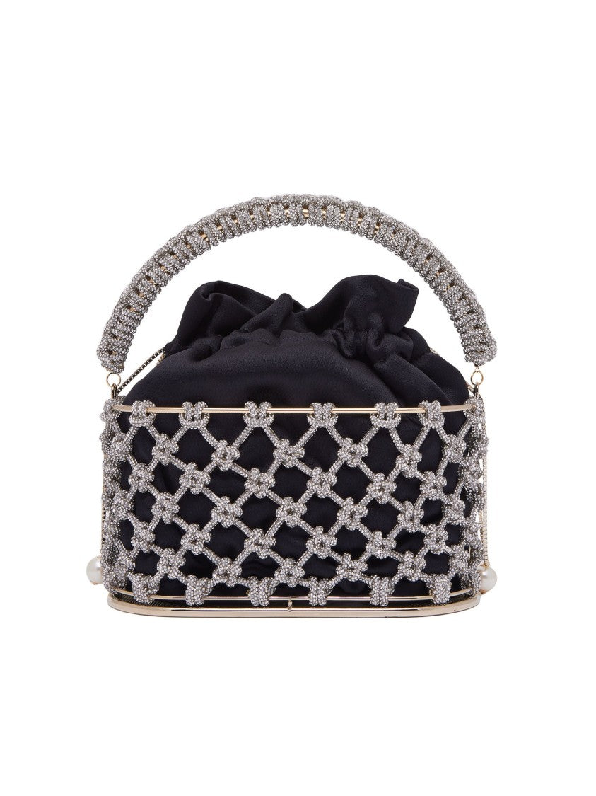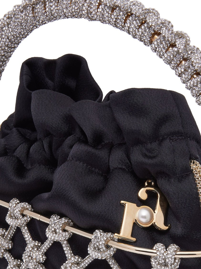 The Rosantica Holli Bag is a perfect blend of artistry and innovation, highlighted by a unique knotting technique. Its structured brass frame and delicate crystal wire details enhance its elegance. A removable black pouch adds practicality, making it both sophisticated and functional.