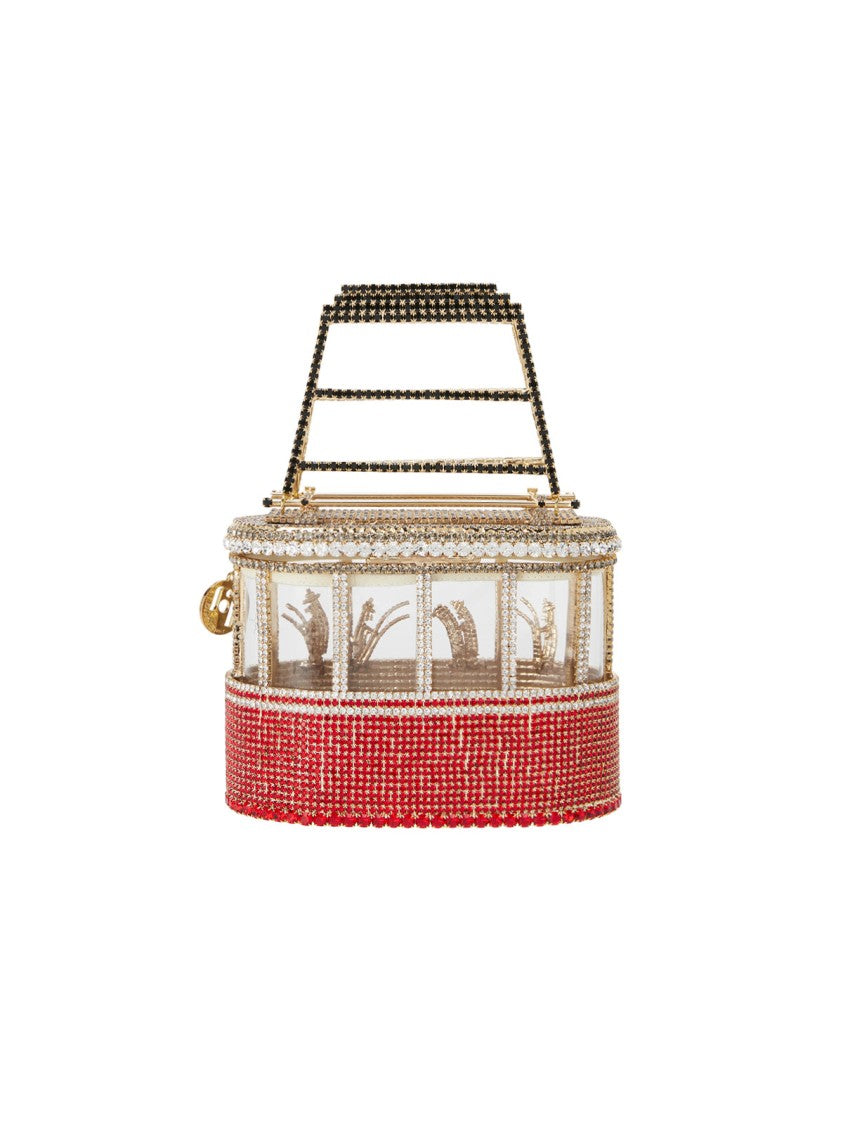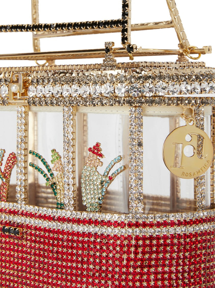 The Monte Bianco handbag by Rosantica embodies the artistry of Italian craftsmanship. This striking piece features a structured silhouette enhanced by a gold-toned brass frame, beautifully adorned with vibrant crystals that capture the light with every movement. The carefully arranged colorful embellishments provide a stunning contrast against the neutral tones, making it a statement accessory for any occasion. A uniquely designed handle adds to its elegance, perfectly balancing functionality with high-fashion aesthetics.