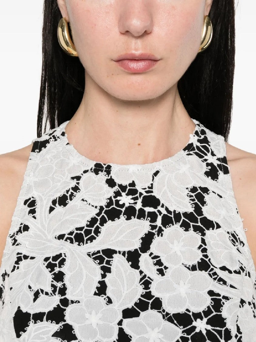 Rotate presents a captivating mini dress that exudes femininity and charm. The fitted bodice features a high neckline and an alluring open back, accentuating the wearer's silhouette. Crafted from high-quality polyester, the dress showcases a stunning floral lace pattern in contrasting shades, creating a delicate yet bold visual aesthetic. The flowing skirt adds movement and grace, making it an ideal choice for those seeking to make a memorable impression.