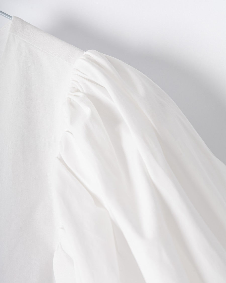 A captivating midi dress from Rotate showcases refined elegance. The design features a graceful V-neckline and charming puffed short sleeves, accentuating the figure. A fitted waist with a delicate tie detail at the bust adds sophistication, while the flowing skirt and practical back zip closure enhance the overall allure.