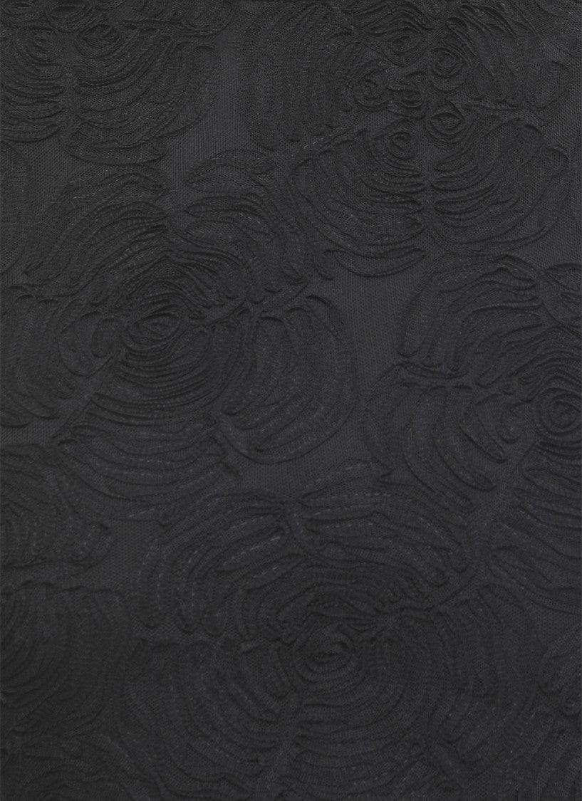 Exuding romance and elegance, this black tulle dress from Rotate is designed with a fitted bodice and sophisticated turtleneck. The sleeveless silhouette features a rear zip closure and flares gracefully at the hem, showcasing intricate all-over rose patterns that add depth and texture to its delicate construction. The lower part of the skirt is semi-sheer, enhancing the ethereal quality of this exquisite piece.