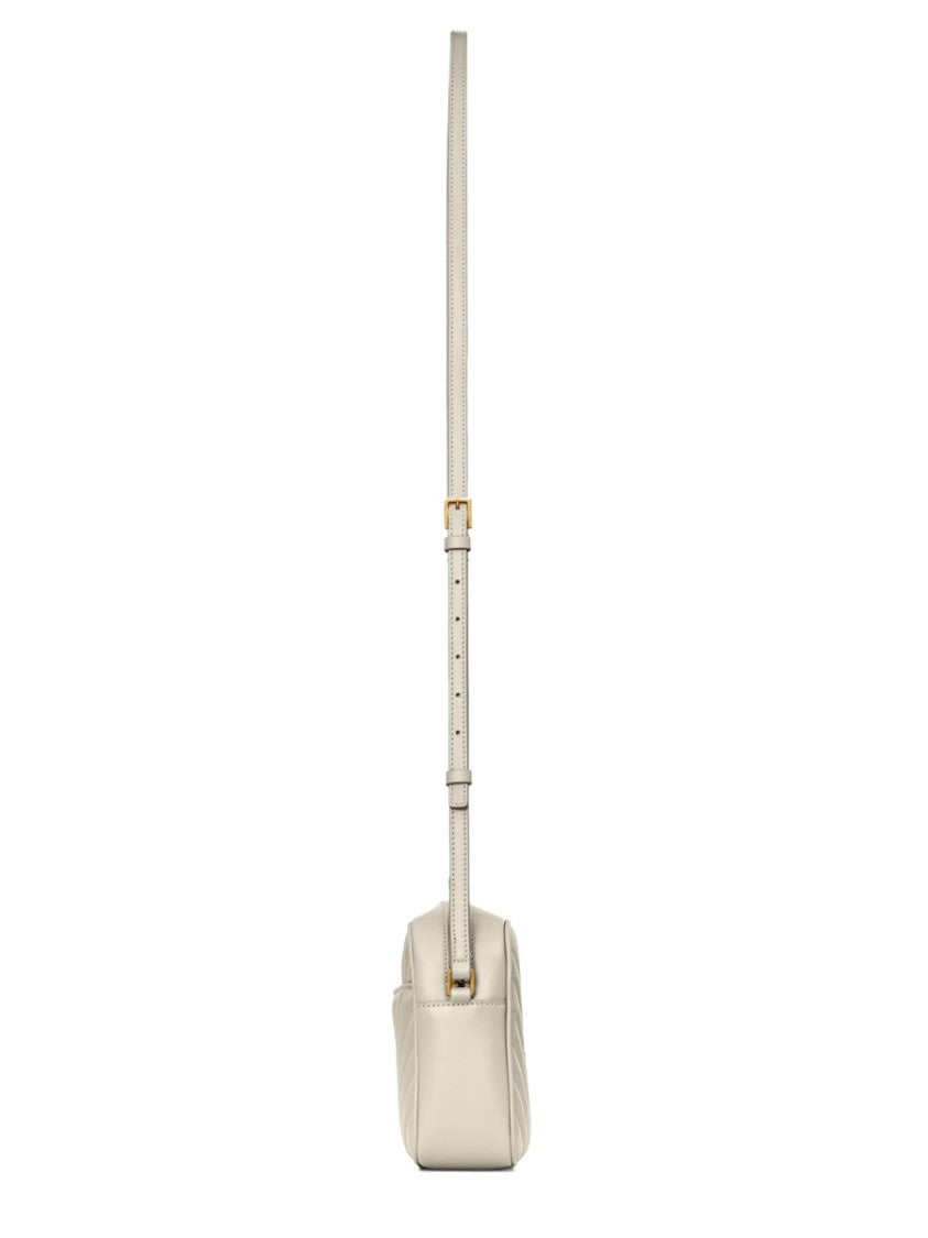Saint Laurent introduces a compact crossbody bag that combines functionality with luxury design. Featuring a unique quilted chevron pattern that beautifully outlines the smooth surface, this bag is highlighted by a prominent metallic logo emblem that radiates elegance. The slim adjustable strap offers versatility for various occasions. Ideal for carrying daily essentials, this piece represents modern sophistication for today's woman.