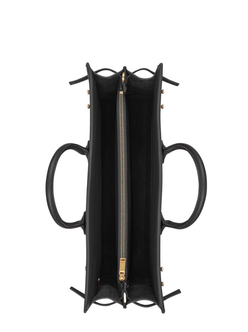 A large structured bag from Saint Laurent, meticulously crafted in Italy from premium textured calfskin leather. The rectangular silhouette showcases dual top handles, a detachable shoulder strap, and gold-tone hardware accents, including a padlock detail and subtle logo embossing. The organized interior features a central zip compartment, ensuring practicality and elegance in every detail.