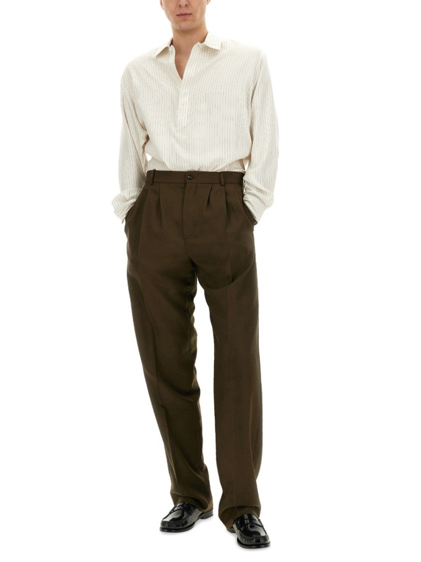 Saint Laurent introduces a relaxed fit striped tunic shirt that seamlessly combines comfort with sophistication. The shirt showcases a subtle vertical pinstripe design, a classic collar, and a partial button placket, creating an effortlessly chic appearance. Made from a soft and lightweight blend, it offers a luxurious feel against the skin. This versatile piece is essential for the modern gentleman, transitioning effortlessly from day to night.