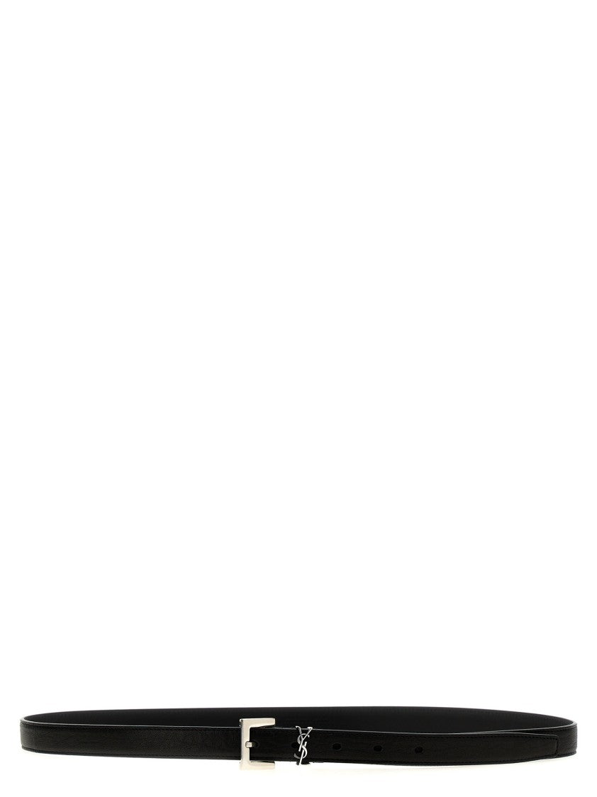 Refined garnet leather belt by Saint Laurent, showcasing a smooth finish and a distinctive metal 'YSL' logo buckle with an intertwined design. This slim accessory includes multiple adjustment holes for a customized fit, while its minimalist aesthetic adds sophistication. An essential piece that embodies timeless luxury and versatility, elevating any ensemble.