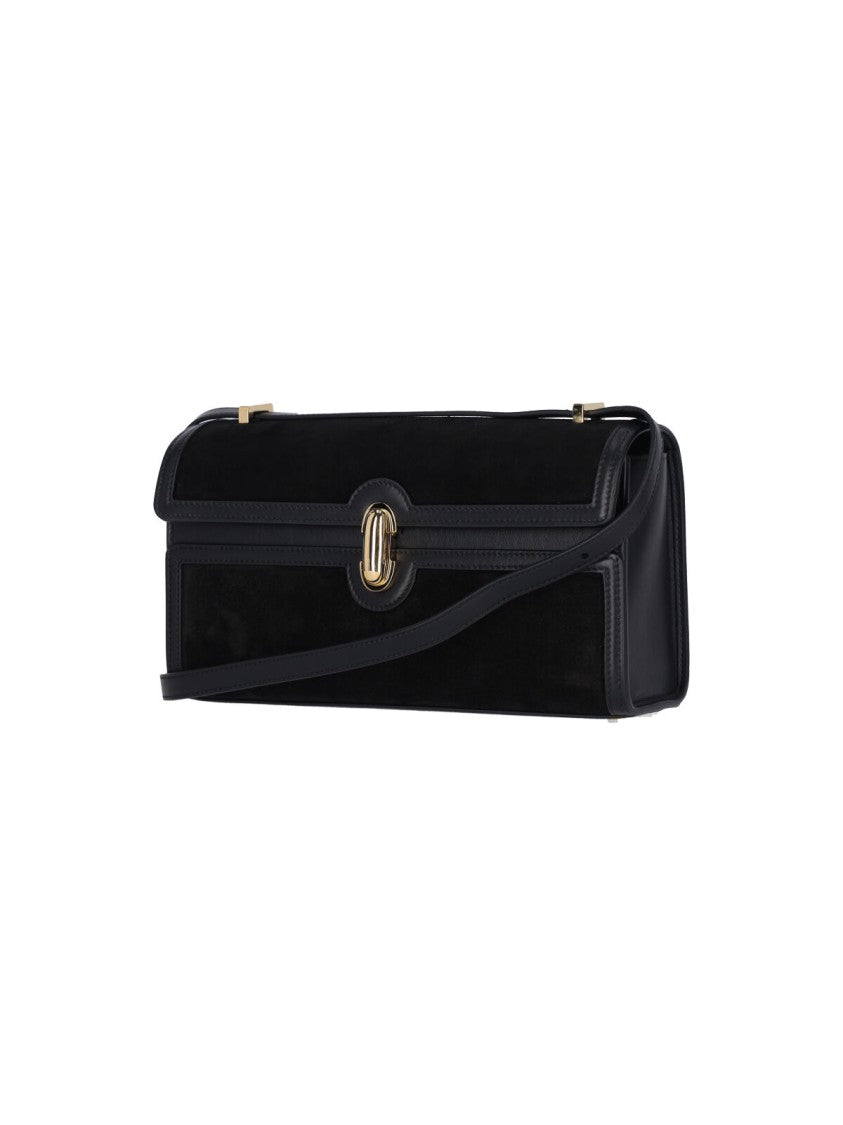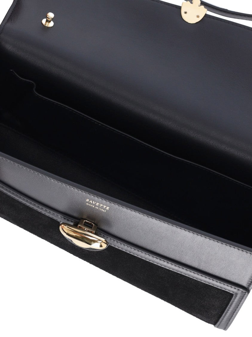 The Symmetry 26 by Savette is a luxurious crossbody bag that embodies both elegance and practicality. Made from soft black suede, it features a distinctive turn-lock flap closure, a spacious main compartment, and an internal flat pocket for organized storage. A convertible strap enhances its functionality, making it suitable for both casual and formal occasions.