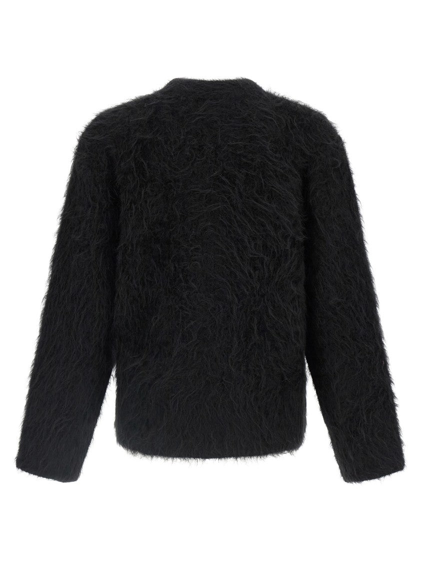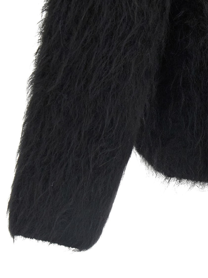 This black sweater from Séfr features a unique crater neckline and long sleeves with dropped shoulders, combining comfort and modern style. The richly textured alpaca blend offers exceptional warmth and depth, making it a must-have for any contemporary wardrobe.