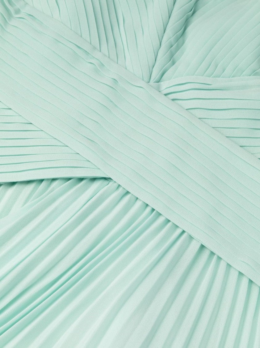 A captivating chiffon midi dress with a sophisticated crossover design. Pleated accents and delicate lace trim at the hem add elegance. The flowing silhouette enhances gracefulness, making it perfect for special occasions.