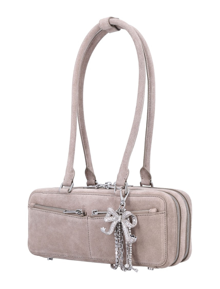 Experience the essence of chic minimalism with this rectangular shoulder bag crafted by Self Portrait. Made from soft suede, this piece boasts a muted taupe hue that harmonizes effortlessly with any ensemble. The design features dual zippered compartments for optimal organization, complemented by long rounded handles for ease of wear. A unique decorative charm with a bow and dangling silver-tone chains adds a touch of whimsy, elevating the overall aesthetic.