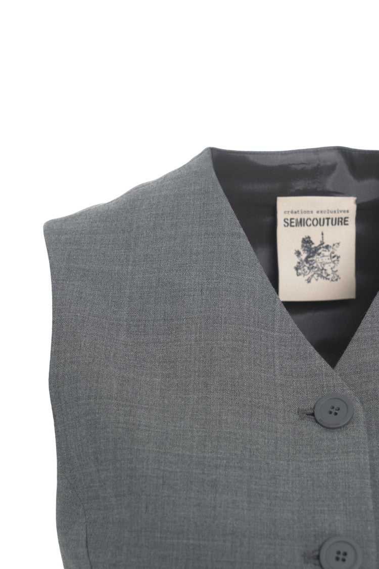 The SEMICOUTURE 'Amber' waistcoat embodies refined elegance with its classic V-neck silhouette and full button closure. A discreet faux chest pocket and an adjustable back strap with a gold-tone buckle enhance its tailored appeal. The smooth fabric in a muted grey tone adds sophistication, making it a versatile wardrobe staple. Made in Italy.