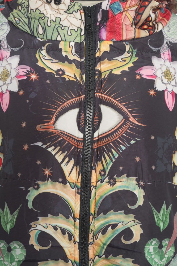 The long 'Eden' quilted down coat by Sittingsuits showcases a captivating artistic design with a central eye motif, enhanced by intricate floral and abstract patterns in a vibrant color palette. This coat is designed for warmth and style, featuring a practical hood and a full-length zipper. Made from premium materials, it offers windproof and water-repellent properties, making it essential for chic, cold-weather layering.