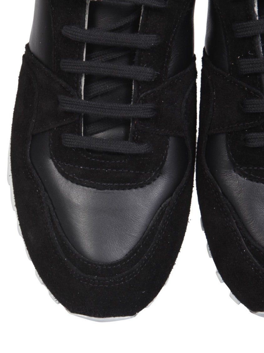 Black low-top sneakers by Spalwart feature a blend of smooth and suede leather panels. The lace-up front guarantees a secure fit, complemented by a textured white rubber sole that offers excellent grip and support. Suitable for both men and women, these sneakers reflect a modern aesthetic perfect for casual and sporty settings.