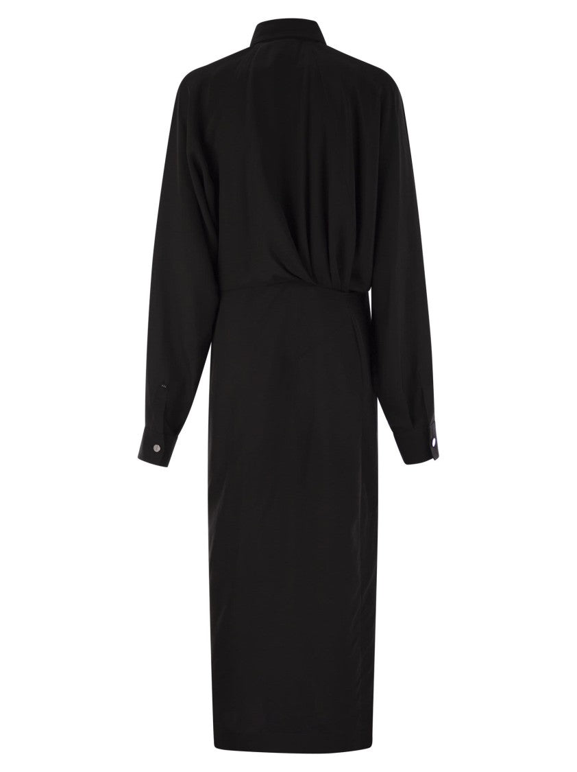 Sportmax introduces a captivating asymmetrical chemisier dress that reflects modern elegance. The diagonal buttoning draws the eye towards the left hip, while voluminous kimono sleeves with stylish cut-outs enhance the silhouette. A refined shirt collar and innovative waist cut reveal pleats at the front and back, combining a generous bust fit with a tailored straight skirt for a sophisticated look.