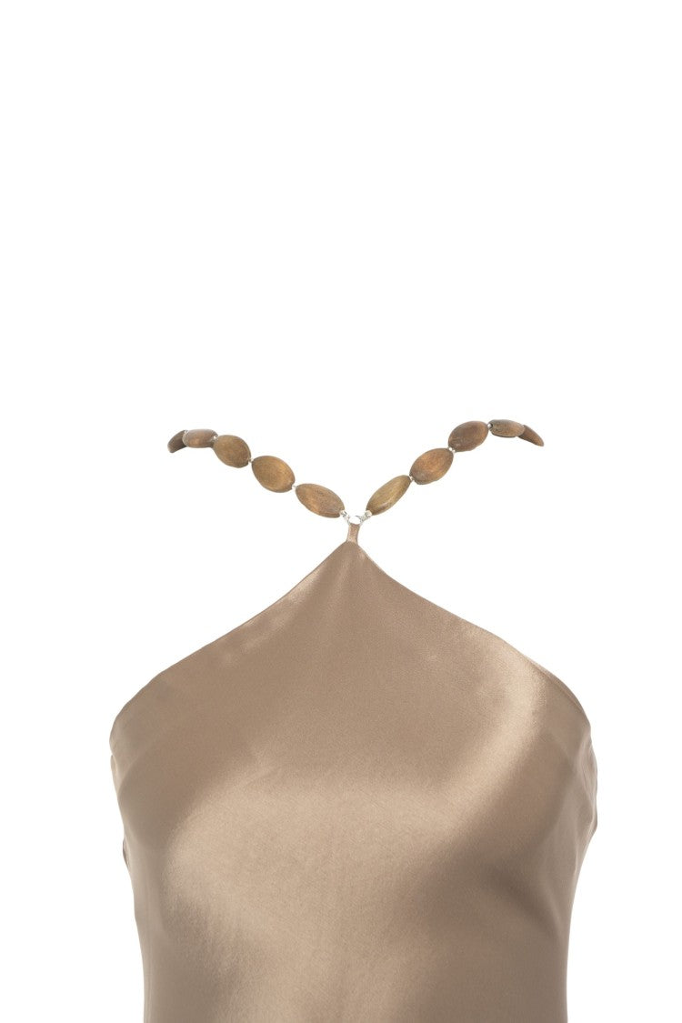 A stunning dress by Staud features an exquisite American neckline with metallic oval embellishments. The flowing trapeze silhouette drapes gracefully, complemented by a back slit for effortless movement. Perfect for elegant gatherings, this piece embodies sophistication and luxury.