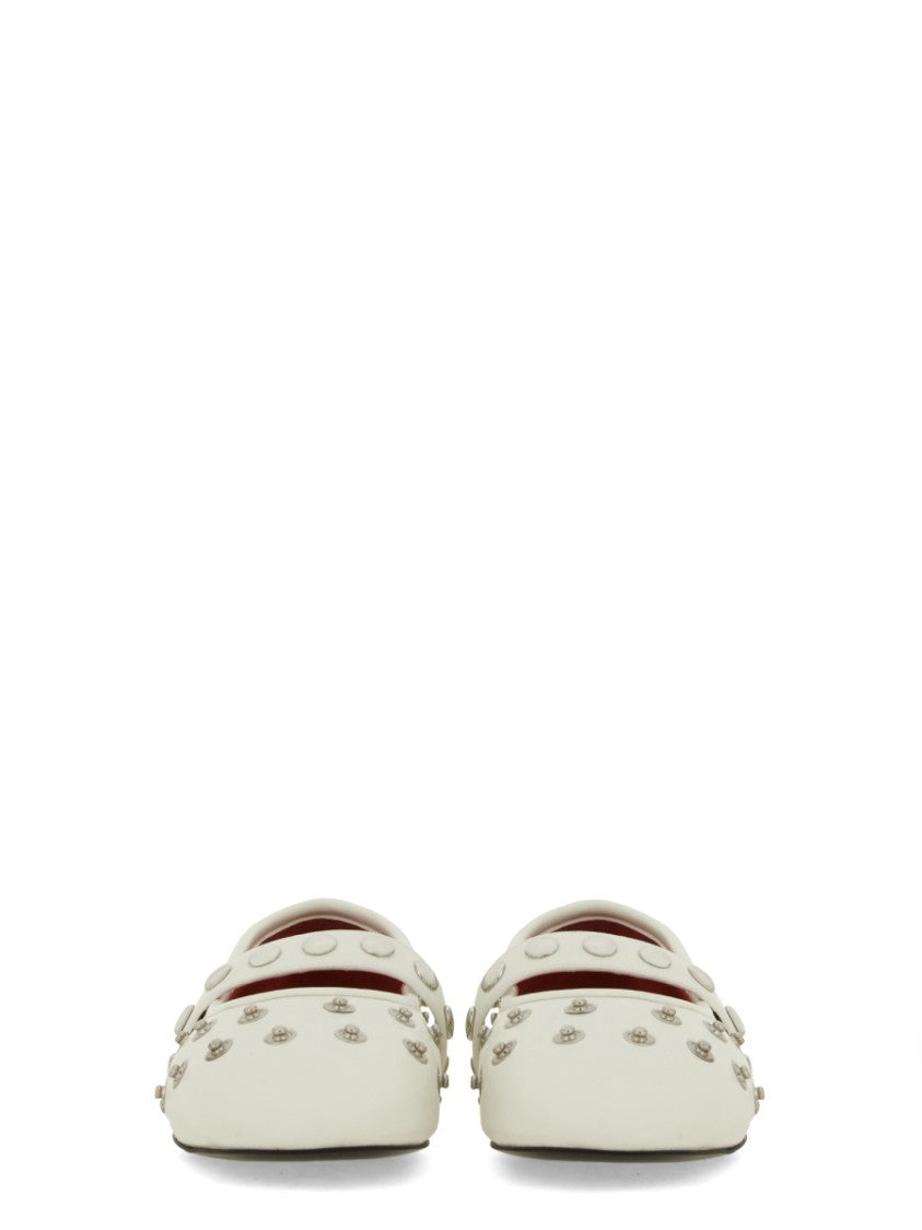 Stella McCartney introduces the 'Ryder' flats, showcasing modern elegance and charm. Made in Italy, these shoes highlight a pointed toe and a unique Mary Jane strap. Decorative studs add a stylish touch, making them perfect for both casual and chic outfits. A smooth finish and comfortable sole ensure practicality while maintaining visual appeal.