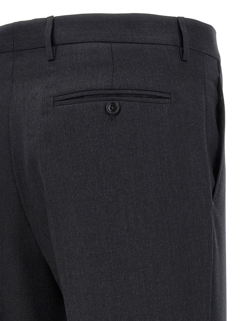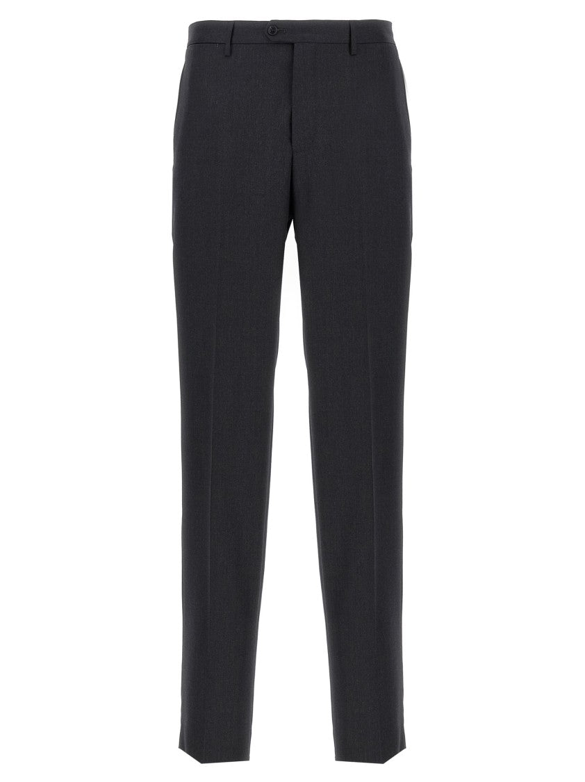 Experience the epitome of sophistication with this melange virgin wool suit by Tagliatore. The deconstructed blazer features a single-breasted design with sleek mirror lapels and a detachable metal brooch, adding a unique flair. Meticulously crafted, it contains flap pockets, buttonhole cuffs, and back slits. Complementing the blazer, the tailored pants showcase a flat front, elegant pleats, and multiple pockets, ensuring both style and functionality. Perfect for formal occasions, this suit embodies timeless elegance.