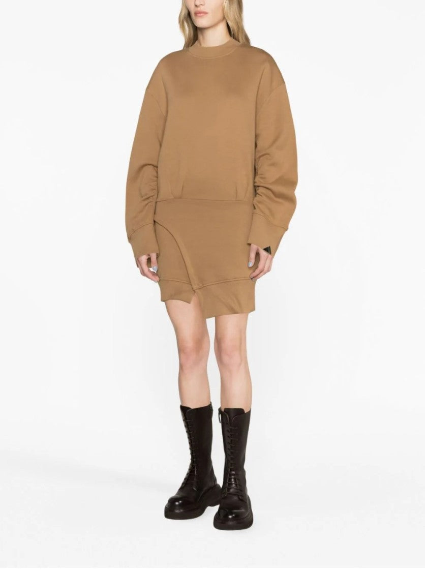 A relaxed-fit mini dress from The Attico crafted from 100% cotton. This elegant piece includes a crew neckline and long sleeves, highlighted by a unique asymmetrical hemline for added style. Perfect for casual outings or trendy streetwear looks.