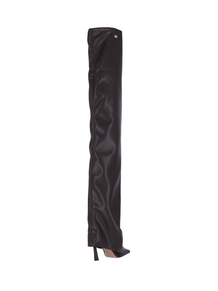 Over-the-knee boots by The Attico in luxurious faux leather with a rich brown hue. These boots showcase a sleek, fitted silhouette, pointed toe, and square heel, making a bold and sophisticated statement. The soft material drapes gracefully, complemented by a durable leather sole.