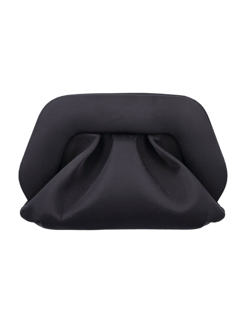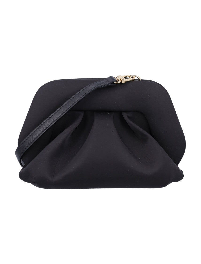 Crafted by THE MOIRè, this black satin clutch bag embodies a sophisticated allure with its soft, gathered design that cascades into gentle folds. The structured frame enhances its refined aesthetics, while a slim strap adorned with a gold-tone clasp provides elegant carrying options. The smooth finish elevates any ensemble, making this clutch the epitome of understated luxury.