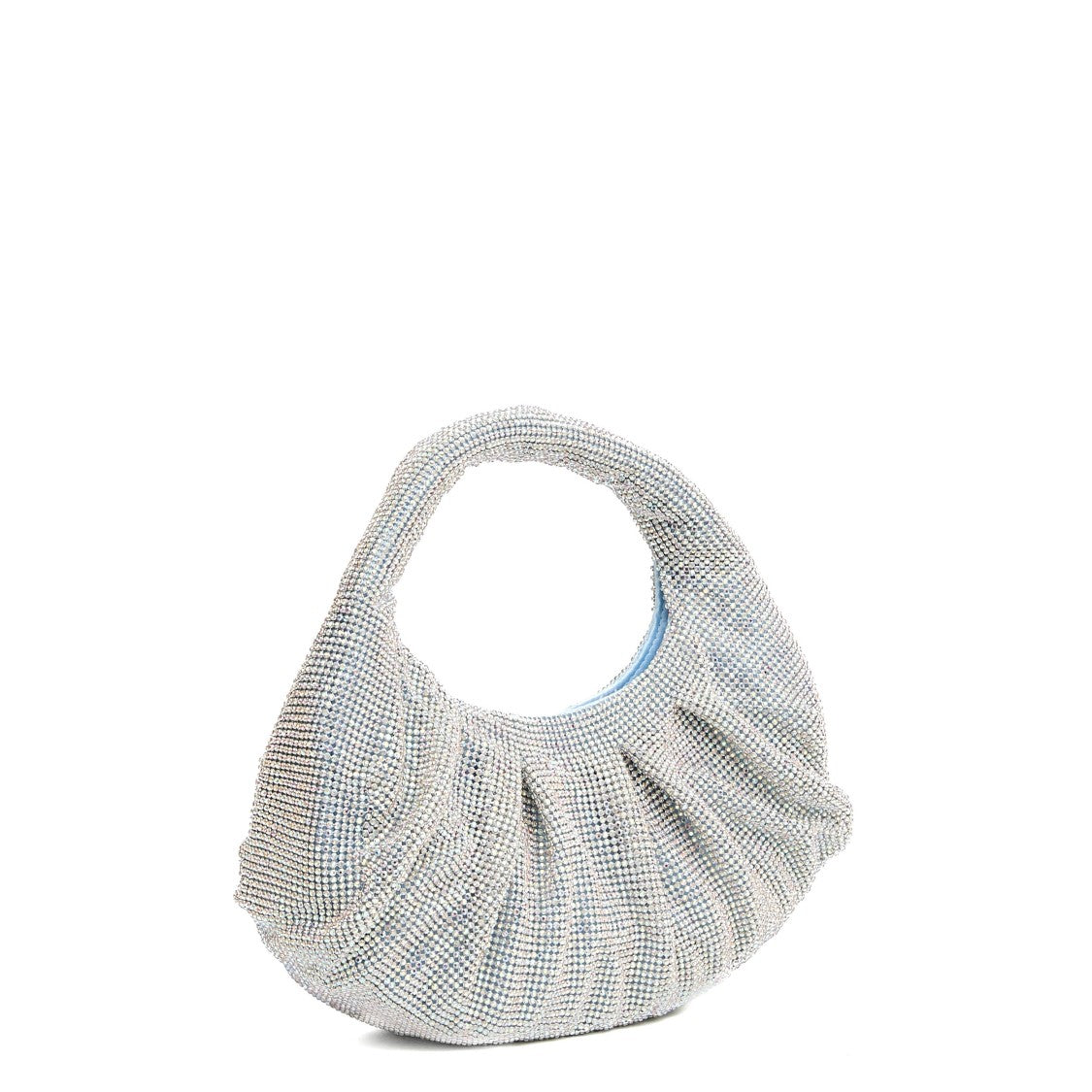 This half-moon handbag by Twentyfourhaitch features shimmering rhinestones for a sparkling effect. The pleated design enhances its elegance, while the practical handle ensures easy carrying. Compact in size, it is perfect for various occasions.