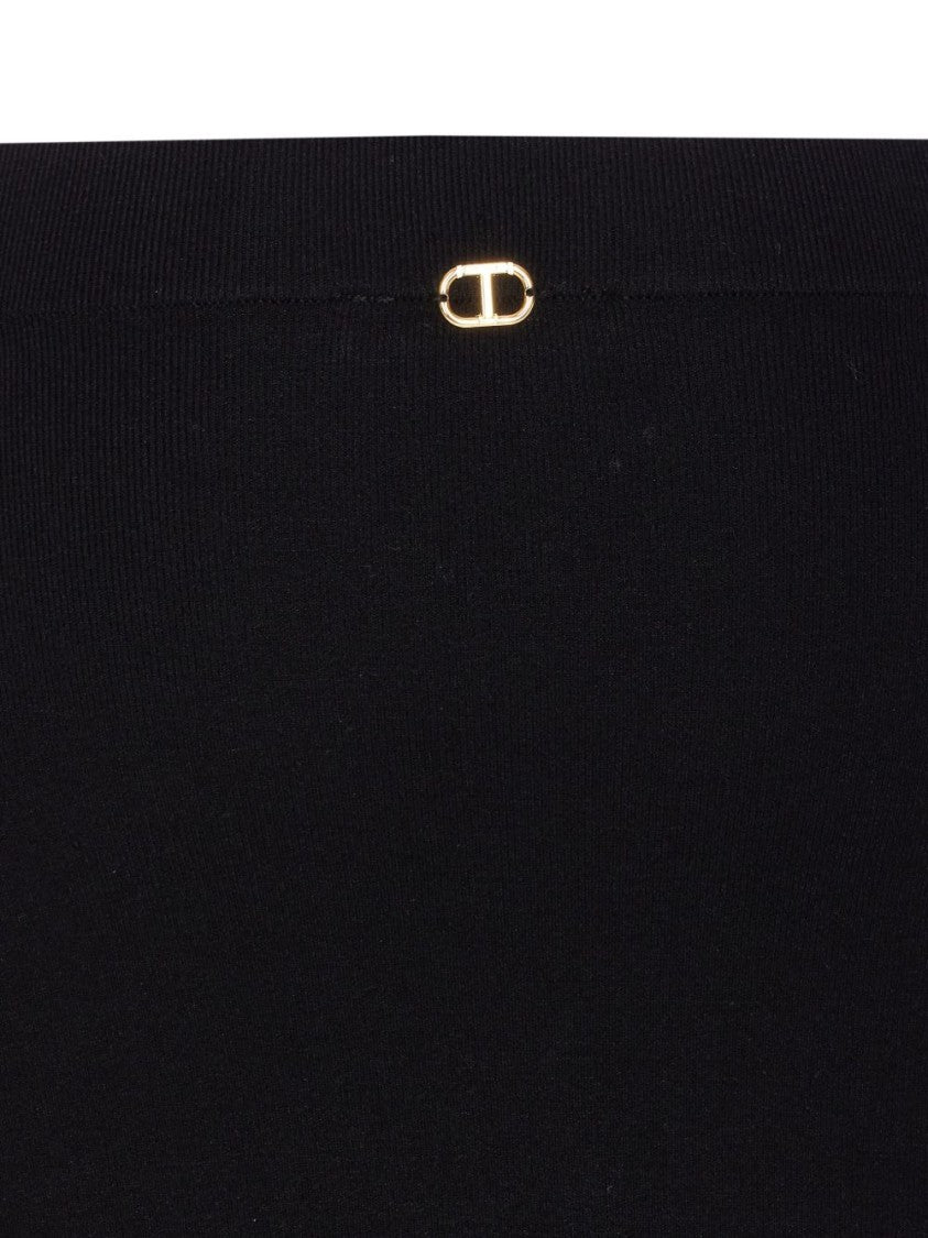 The Twin-set midi skirt combines elegance with comfort, made from soft and smooth fabric that enhances any wardrobe. It has a straight silhouette, delicate lace trim at the hem, and a stylish side slit for graceful movement. A subtle gold-tone logo near the waistband adds refinement, making it suitable for various occasions.