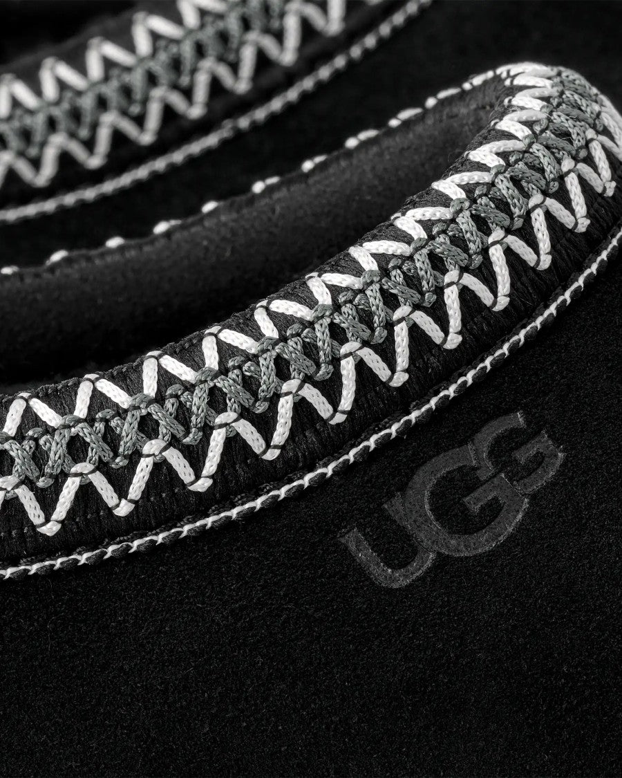 UGG Tasman II slip-on shoes provide exceptional comfort with their soft black suede construction. The luxurious sheepskin lining and insole create a cozy feel, while the lightweight EVA sole made from sugarcane guarantees durability. Braided detailing around the collar highlights UGG's commitment to quality craftsmanship, making these shoes ideal for casual and comfort-oriented settings.