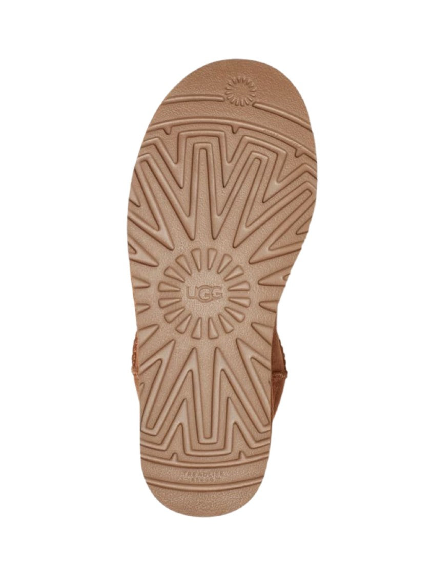 UGG presents these exquisite suede ankle boots, designed to offer both comfort and style. Featuring a warm brown suede exterior, these boots boast a rounded toe and a low-profile silhouette, enhanced by a plush light-colored shearling lining that ensures warmth. The flat sole is crafted with a textured grip for superior traction, while a convenient pull tab at the heel allows for effortless wear. Perfect for adding a cozy touch to your casual wardrobe.