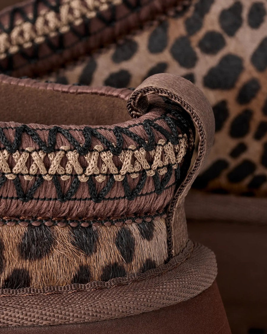 Experience the luxury of UGG with the Ciabatta W Tazz Caspian, a stylish slip-on shoe made from premium leopard print pony hair. This design highlights a plush UGGplush™ lining and a unique braided trim crafted from 100% recycled polyester, showcasing a commitment to sustainability. The elevated platform sole, made from sugarcane EVA, ensures comfort while providing a chic silhouette, ideal for casual outings. The subtle embossed UGG® logo adds a touch of elegance, merging fashion with functionality seamlessly.