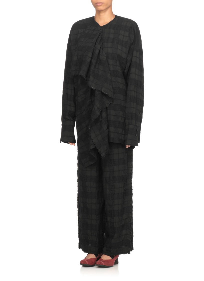 This black Uma Wang blouse combines modern design with timeless elegance. Made from a high-quality wool blend, it features a delicate checkered pattern, a crew neck, and long sleeves. The unique asymmetric fastening showcases cascading ruffle-like layers held in place by buttons, while slightly frayed edges add texture, making it perfect for special events.
