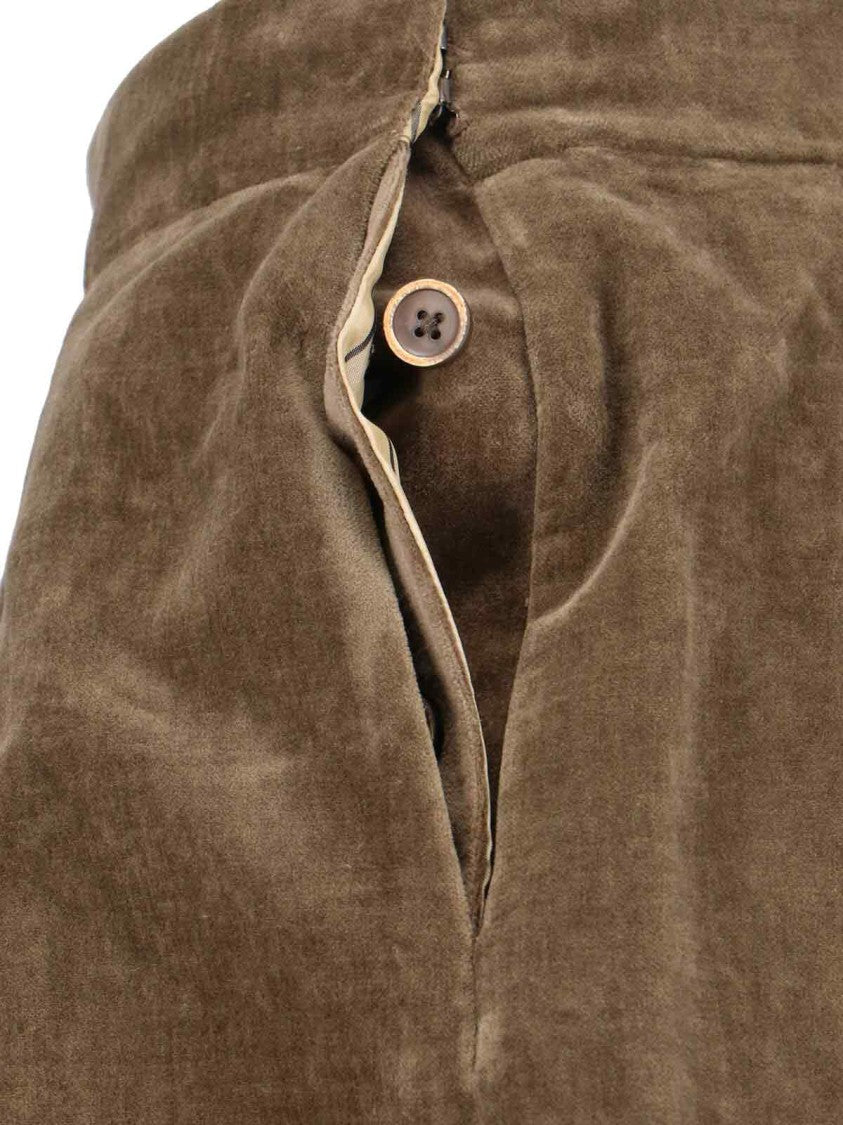 Uma Wang presents a knee-length skirt with a voluminous A-line silhouette, elegantly complemented by deep pleats at the front and sides. This striking piece features a structured waistband and practical side pockets, while the back showcases a refined button and zipper closure. Crafted from soft, velvety fabric in a muted brown tone, this skirt embodies a seamless blend of vintage inspiration and contemporary appeal.