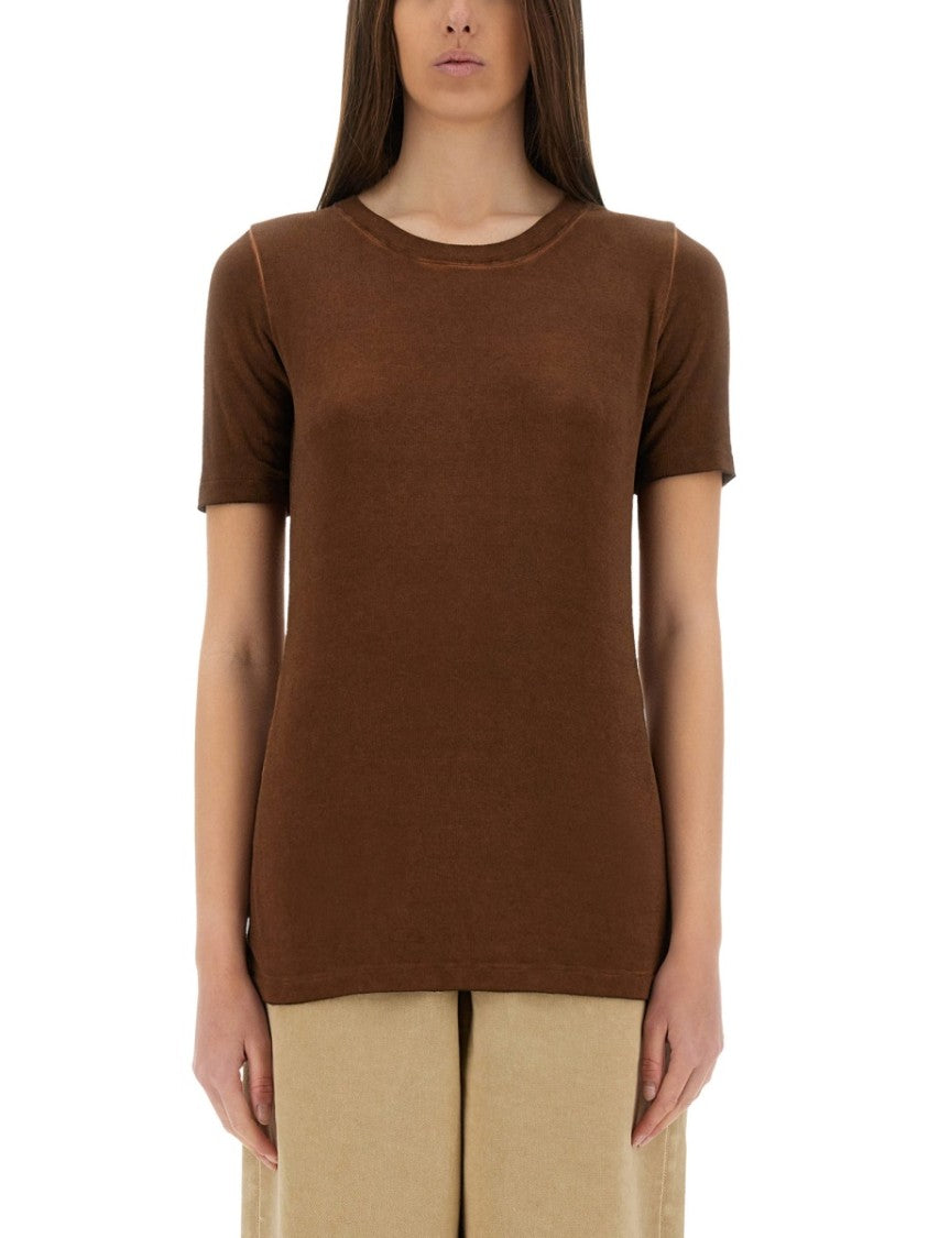 Experience effortless elegance with the Uma Wang fitted top, crafted in Italy from a sumptuous blend of 98% viscose and 2% elastane. The design showcases a classic crew neckline and short sleeves, perfectly tailored to hug the body. A distinctive seam detail at the back elevates its contemporary silhouette, while the smooth finish offers a luxurious touch. Perfect for a casual yet refined look, this top is a versatile addition to any wardrobe.