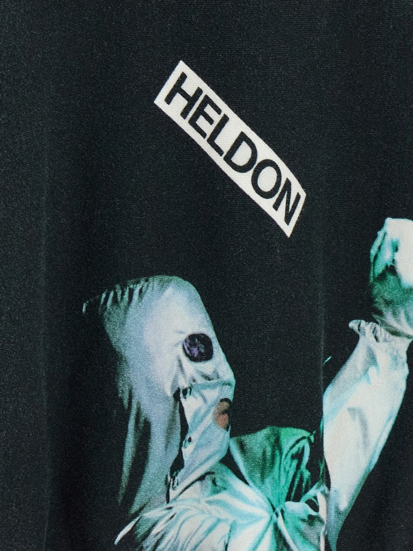 Undercover offers an oversized sweatshirt made from 100% brushed cotton. The design showcases a bold sublimated print of a figure in a hooded outfit, complemented by 'HELDON' and 'STAND BY' text patches. Featuring a round neckline, dropped shoulders, and long cuffed sleeves, this sweatshirt captures a relaxed yet fashionable essence, appealing to modern streetwear fans. The product highlights the brand's commitment to exceptional craftsmanship and innovative design.