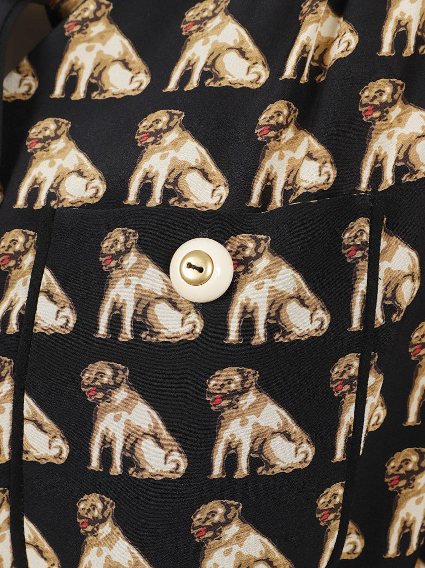 Black dog print dress by Valentino Garavani features a chic design with a belted waist and long sleeves. The enchanting beige and brown dog print is set against smooth, silky fabric that drapes elegantly, perfect for casual sophistication during daytime outings.