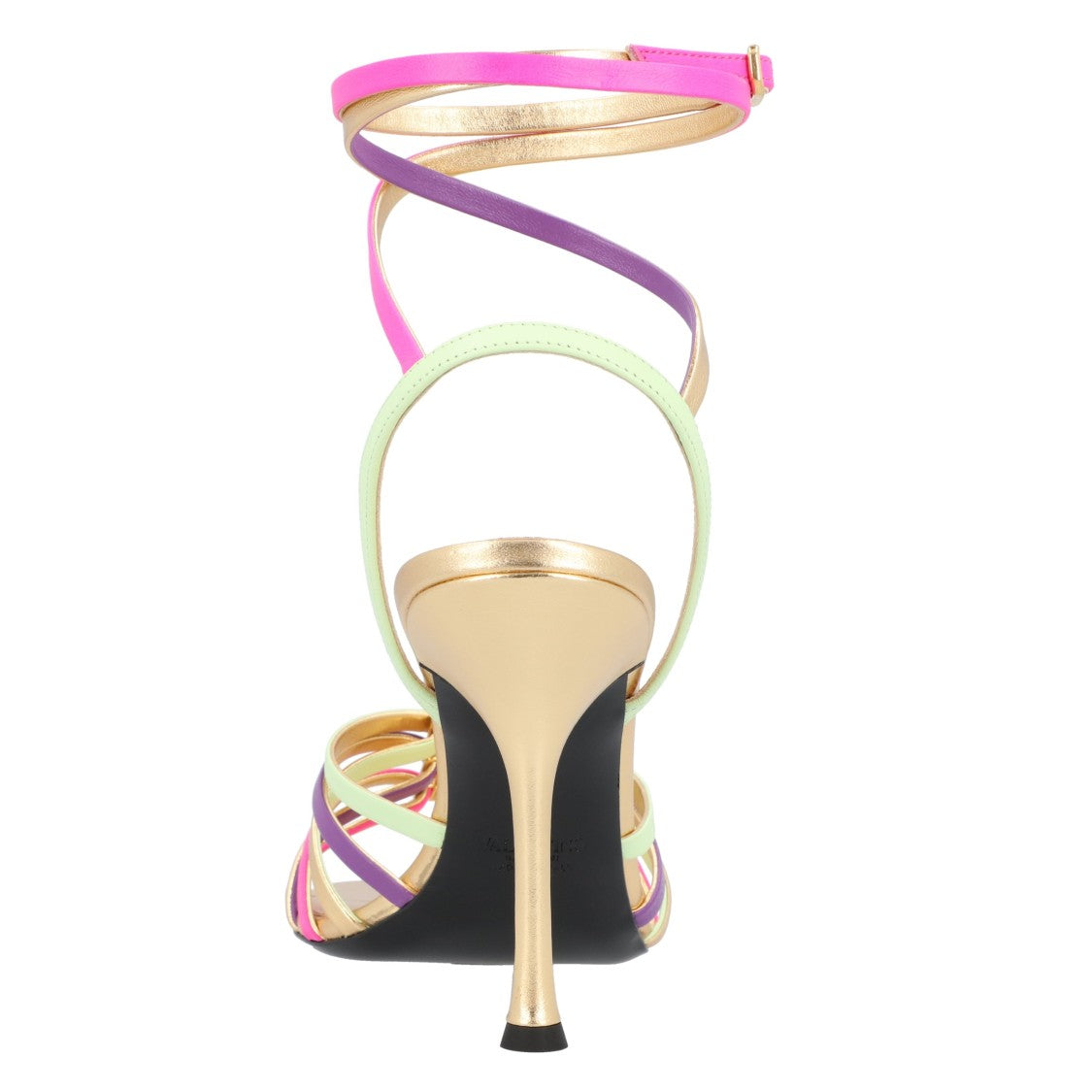 Valentino sandals in multi nappa leather showcase a captivating array of colorful straps complemented by gleaming gold-tone hardware. Designed for both elegance and comfort, these sandals feature an adjustable buckle ankle strap and a smooth leather insole and sole, ensuring a secure fit. With a heel height of 3.9 inches, they epitomize sophistication while remaining effortlessly wearable.