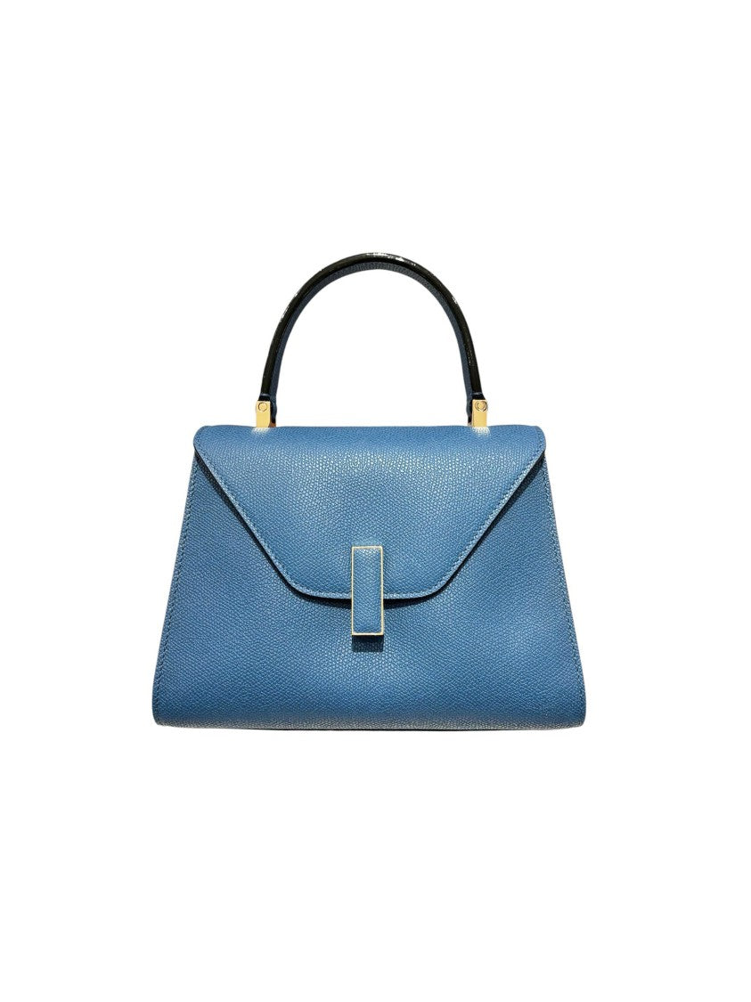 The Iside Top Handle Mini Bag showcases urban craftsmanship and refined elegance. This structured handbag is made from signature Millepunte calfskin in a luxurious blue shade, combining style with functionality. A gold-tone clasp closure with a leather insert adds sophistication, while hand-painted black Inchiostro lines reflect Valextra's artistry. Finely lacqued Costa edges enhance its allure. The bag includes a detachable and adjustable strap, allowing for versatile wear as a shoulder bag or top handle, perfect for daily outings or evening soirées.