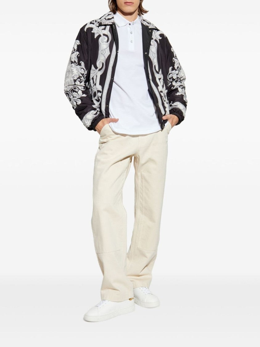 An emblematic short-sleeve polo shirt made from 100% premium cotton with a clean white finish. The traditional collar includes a three-button placket and a subtle embroidered emblem, making this relaxed-fit design a perfect addition to any sophisticated casual collection.