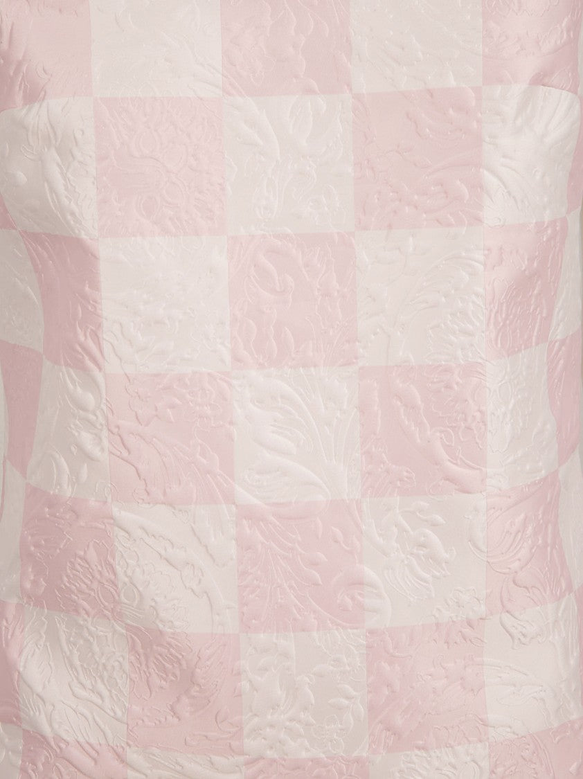 Versace introduces a stunning sleeveless dress that showcases a square neckline and a textured checkerboard design in soft pink and white. The straps are beautifully embellished with decorative buttons, adding a touch of sophistication. Ideal for casual outings or elegant events, this dress captures timeless elegance.