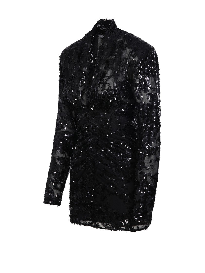 This mini dress by Victoria Beckham radiates glamour and sophistication. A fitted silhouette highlights the waist, complemented by a shimmering sequin overlay for added allure. Its deep neckline contributes to an elegant look, ideal for evening events.
