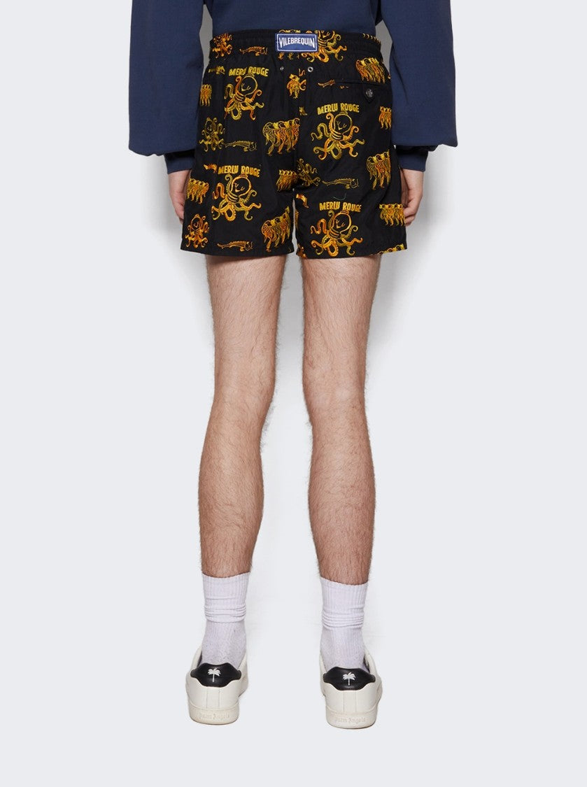 These captivating swim shorts feature an elastic waistband and adjustable drawstring for a personalized fit. Vibrant embroidered sea creatures add a playful touch to the sleek silhouette, while practical side pockets and a back pocket enhance functionality. Fully lined with water-resistant mesh, they provide comfort for your beach adventures.