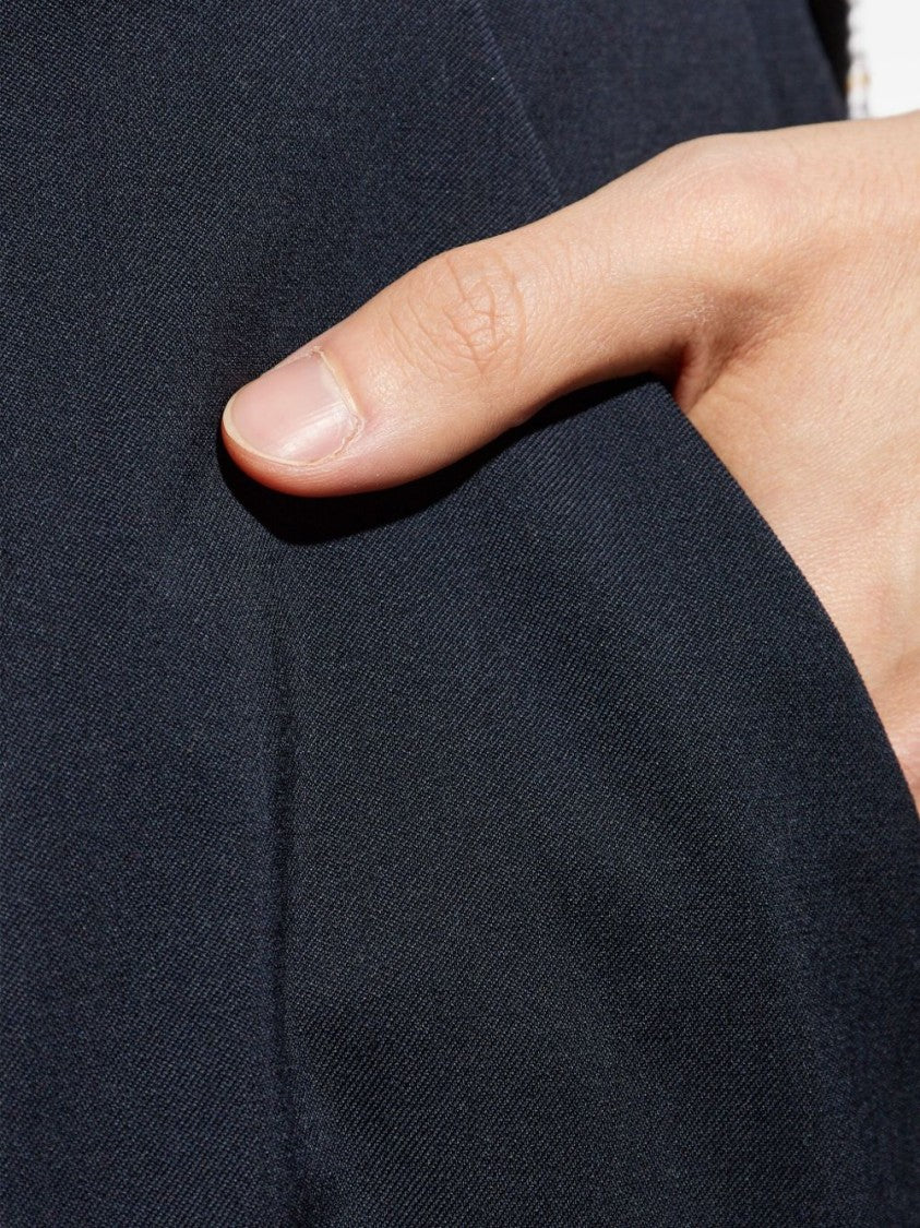 Navy wide-leg trousers from Vivienne Westwood designed for the modern man. Tailored waistband and refined button detail create a sophisticated silhouette. Side pockets enhance practicality, suitable for casual and formal occasions.