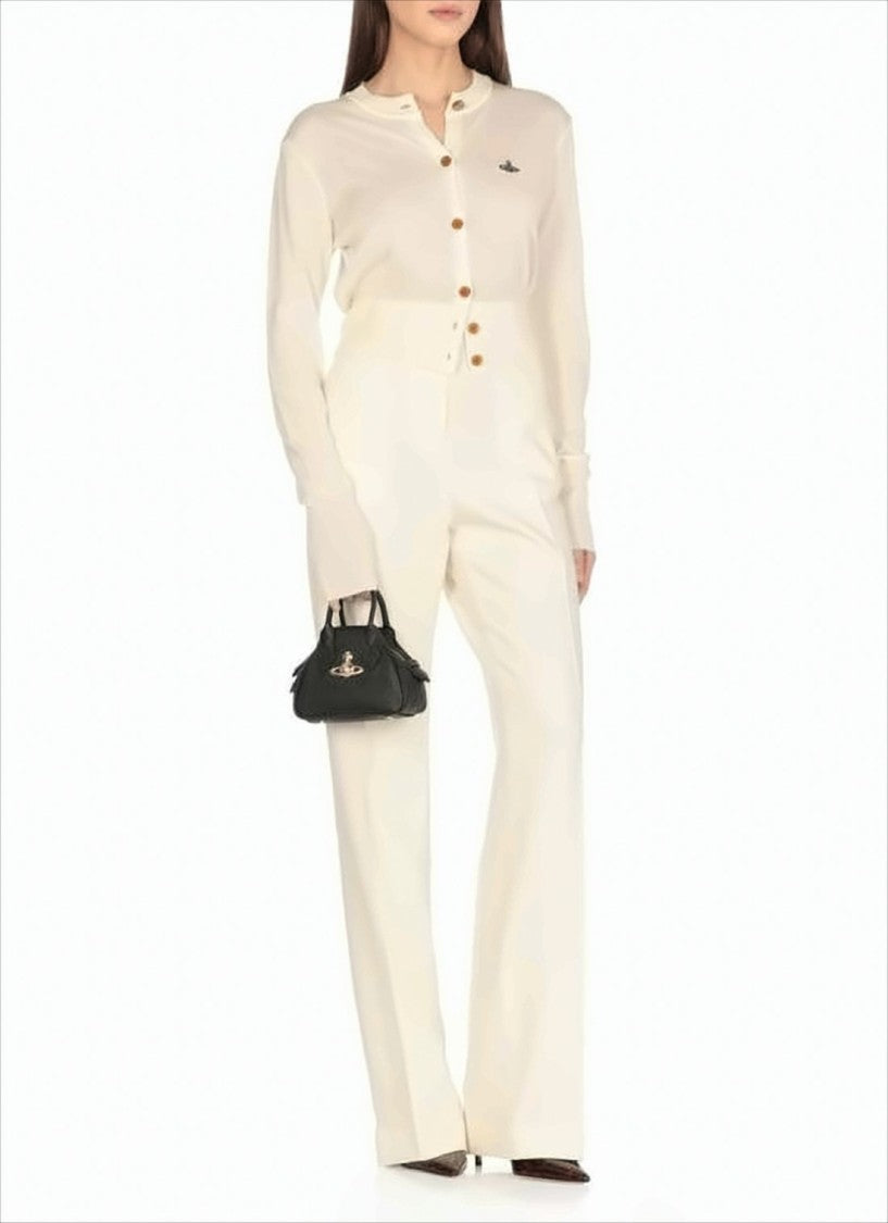 A compact crossbody bag from Vivienne Westwood, meticulously crafted in Italy from textured synthetic leather. This structured silhouette features dual top handles, a detachable shoulder strap, and an elegant zip closure. The standout metallic orb emblem on the front enhances its luxurious appeal, making it a versatile accessory for any occasion.