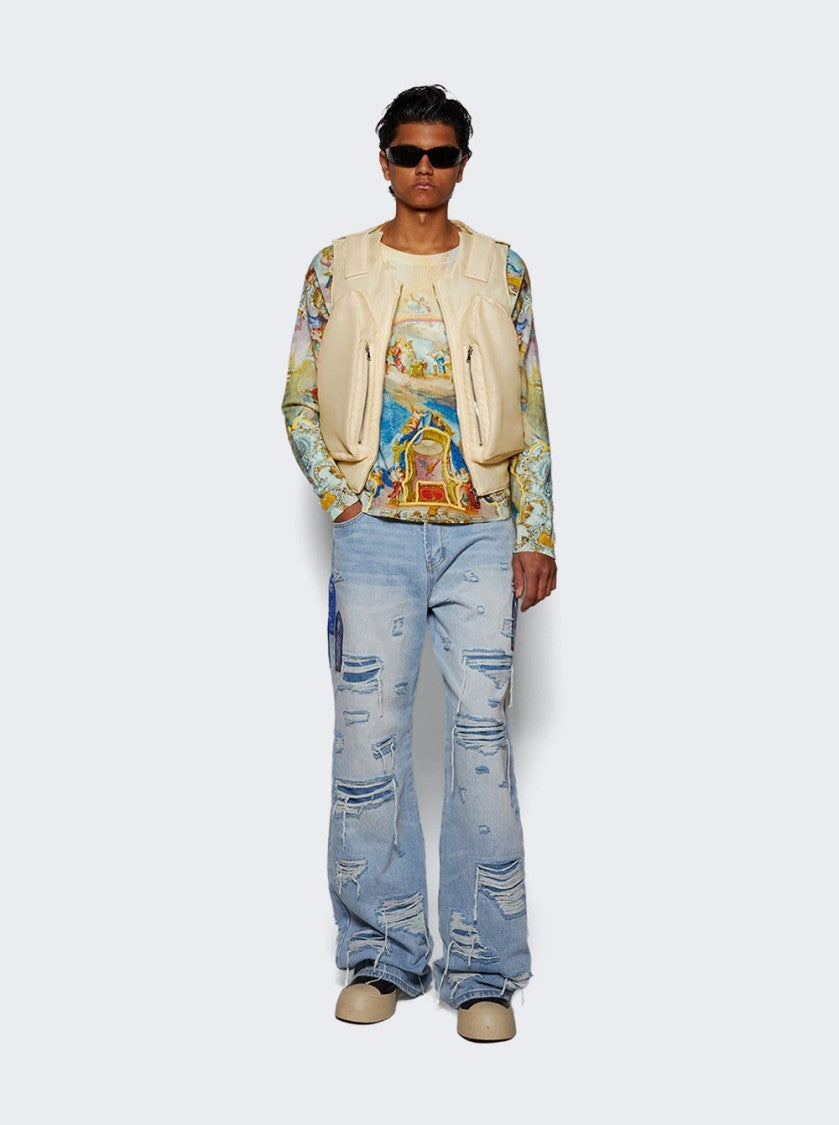 Who Decides War presents a boxy fit vest made from premium organza. This sleeveless design features adjustable straps and a unique stained glass window cargo pocket, adding a distinctive touch. Ideal for the modern man, it embodies contemporary streetwear, seamlessly transitioning from casual outings to urban adventures.