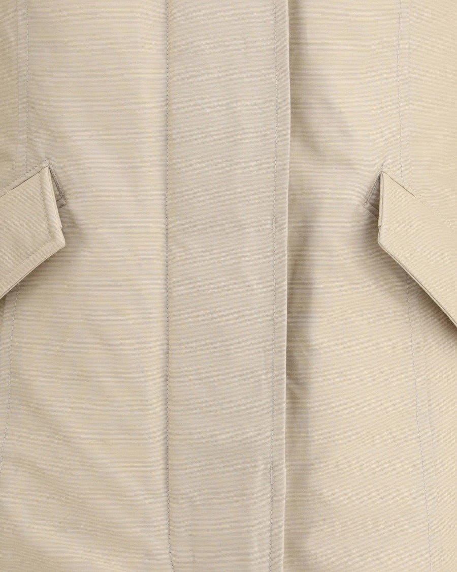 The Woolrich Arctic Parka embodies outdoor sophistication, made from durable Ramar Cloth and treated with Teflon for superior water and wind resistance. A sleek matte finish in light tan enhances its appeal, while the concealed zip closure and adjustable hood add practicality. Angled flap pockets provide storage, and ribbed inner cuffs ensure a snug fit, perfect for chilly weather.
