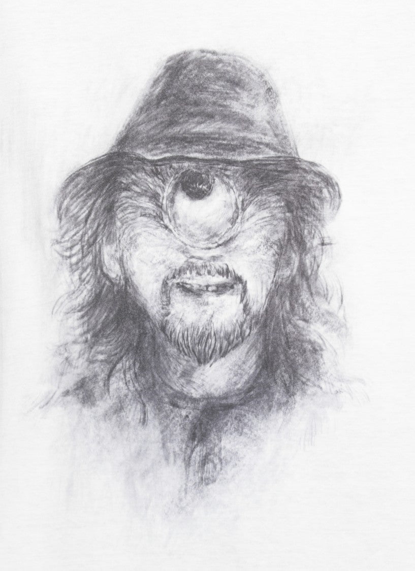 A distinctive white cotton t-shirt from Yohji Yamamoto Pour Homme, featuring a round neck and short sleeves. The front showcases a surreal monochrome sketch of a man with a hat and a single large eye, creating an artistic and intriguing visual statement. This casual t-shirt offers a relaxed fit, perfect for stylish everyday wear.