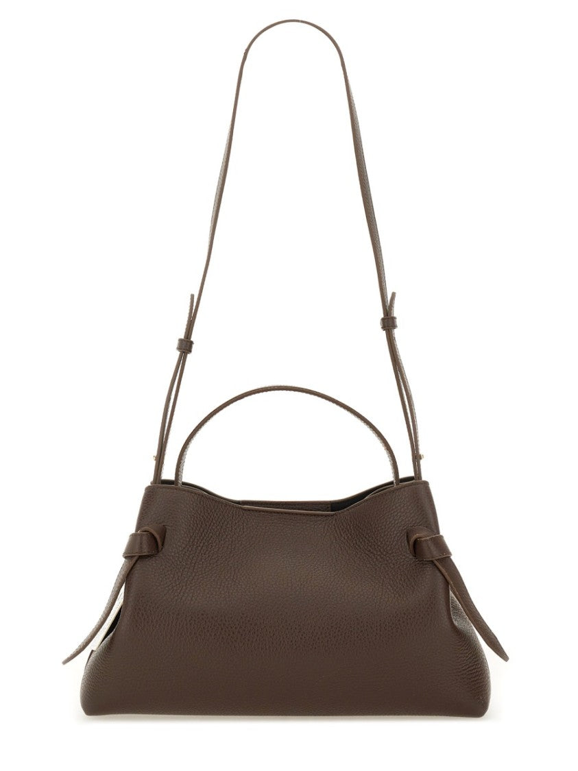 The Yuzefi Gyoza shoulder bag features a structured silhouette made from premium bovine leather from Spain. Its minimalist design includes a top handle and an adjustable shoulder strap, making it suitable for various occasions. A gold-tone clasp adds a refined touch.