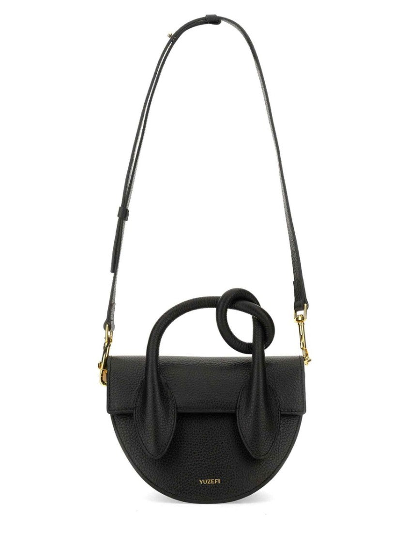 The Yuzefi Borsa 'Pretzel' is a striking half-moon handbag made from 100% bovine leather with a textured finish. Its elegant knotted handle and flap closure enhance its charm, making it an ideal accessory for the modern, chic woman. Spacious enough for all essentials, this bag embodies a minimalist yet sophisticated aesthetic, elevating any outfit with its unique design.
