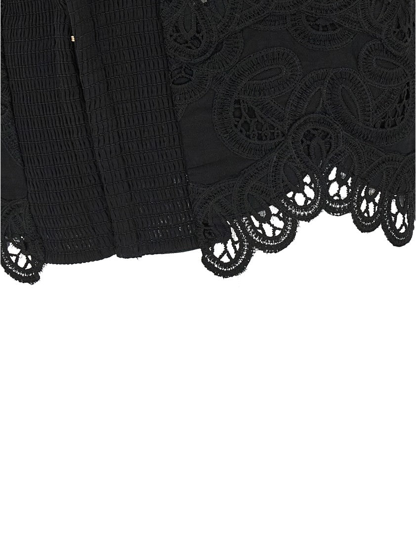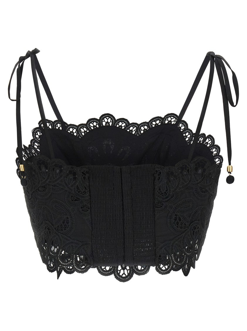 The 'Rhiannon' top by Zimmermann embodies femininity with intricate embroidery and perforated cotton fabric. A structured bodice and smock stitch elastic back ensure comfort, while thin adjustable shoulder straps tie into delicate bows. The scalloped lace trim enhances its sophisticated aesthetic, making it a versatile addition to any elegant wardrobe.